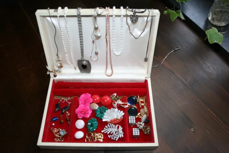 ÄLDRE SMYCKESKRIN MED BIJOUTERIER, SMYCKEN
