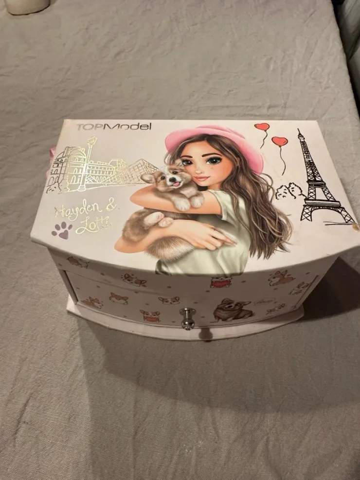 Smyckeskrin med spegel och utdragbar låda. Motiv med hundar och TopModel-flickan. Perfekt för att förvara smycken eller andra småsaker.