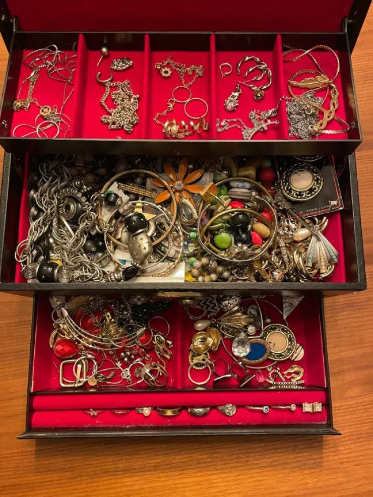 Säljer ett smyckespaket. Smyckeskrin ingår i använt skick, såg att lådan var lite lös har inte kollat närmare på skick (se bilder) ca 3.6 kg totalt.