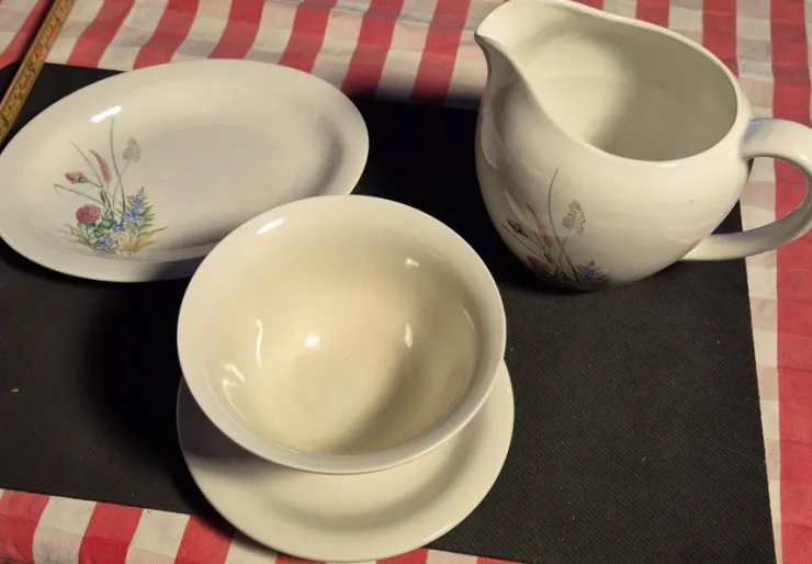 Fin porslinsservis med vackra blommönster. Såsskål ,fat och en tillbringare. Fint skick