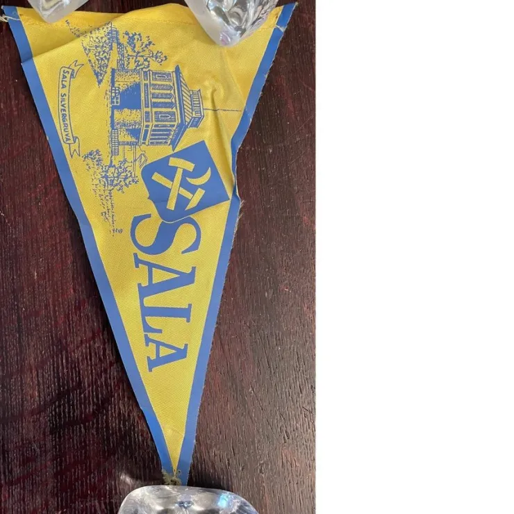 Vimpel från Sala. Motiv på bara ena sidan. Dubbla hål för upphängning. Kan behöva strykas lite.