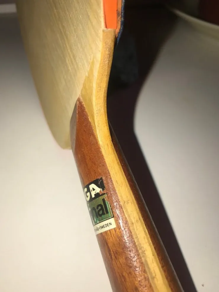 Säljer ett Stiga Original bordtennisrack. Racket är tillverkat av STIGA i Sverige och har en ”backside top spin” markering på skaftet.