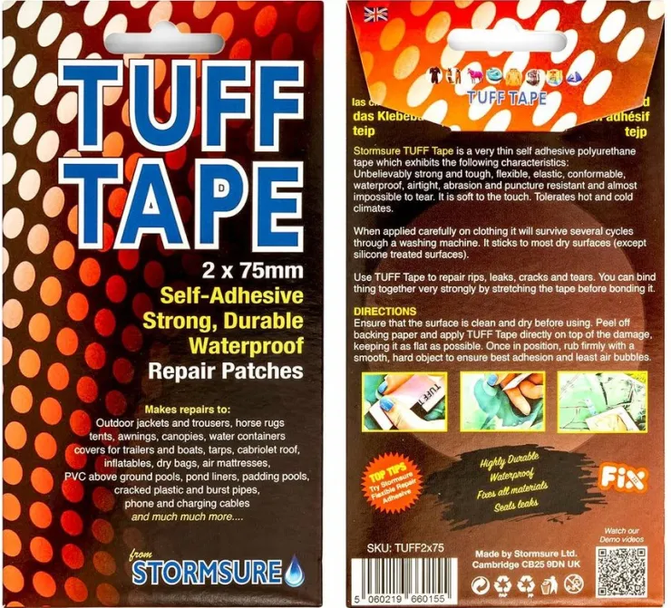 Stormsure ’TUFF Tape’ är en mycket stark, klar, självhäftande, vattentät tejp som säljs som individuella förskurna lappar och remsor i olika former och storlekar. TUFF Tape är gjord av en tunn, men mycket tuff polyuretanfilm med ett självhäftande lim på baksidan.