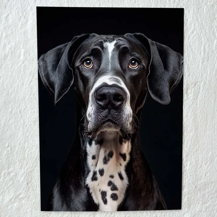 Högkvalitativt tryck: Ett realistiskt och stilfullt porträtt av en Grand Danois, tryckt på A4 premium glansigt papper.