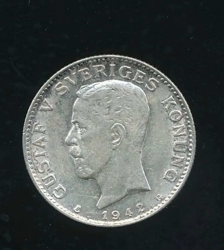 Svensk sølvmynt fra år 1942, med en værdi af 1 krone. Mynten viser Kong Gustav V på den ene side og det svenske rigsvåben på den anden.