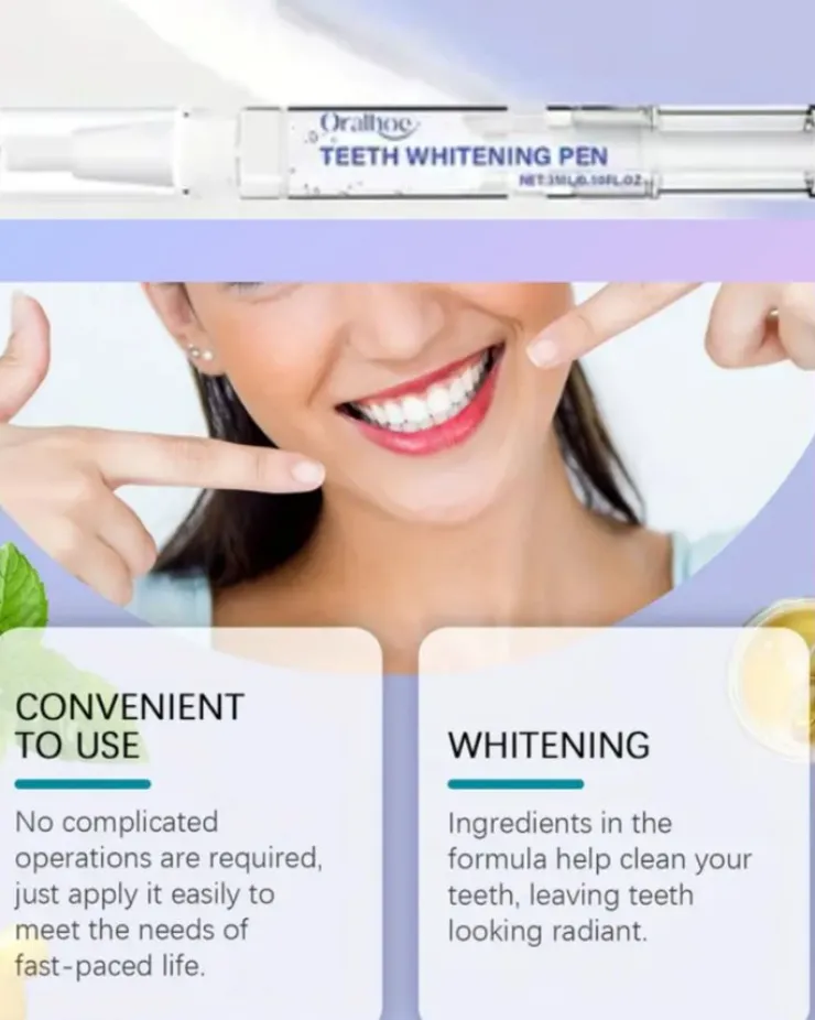 Här är en Tandblekningspenna för ett enklare och bekvämare sätt att bleka tänderna hemma. Formulan innehåller ingredienser som hjälper till att rengöra tänderna och ge dem en strålande vithet. Enkel att använda – applicera tunt på varje tand och vänta i 30 sekunder innan du sköljer. Innehåller Vitamin C, Hedysarum Alhagi Leaf/Stem Extract, Mentha Piperita (pepparmynta) olja, Xylitol och Glycerin. Lätt att bära med sig, perfekt för resor.