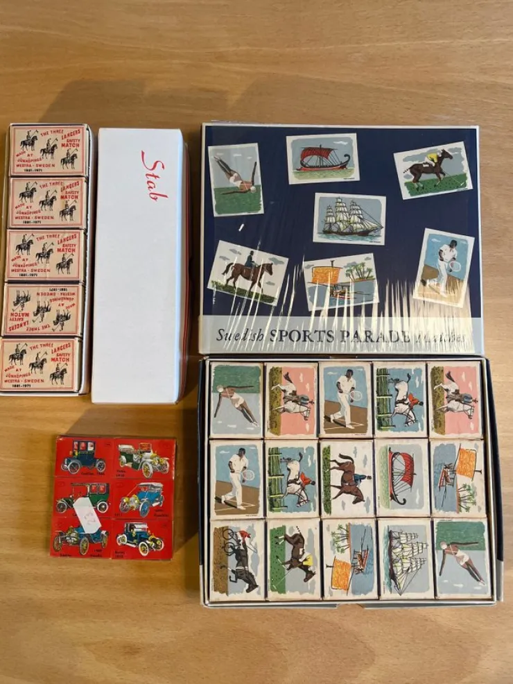 Samling matchaskar och tändsticksaskar med olika motiv. Bland annat två ask med "Swedish Sports Parade" och flera askar med "The Three Lancers" samt en ask med historiska bilar. Säljes som ett paket