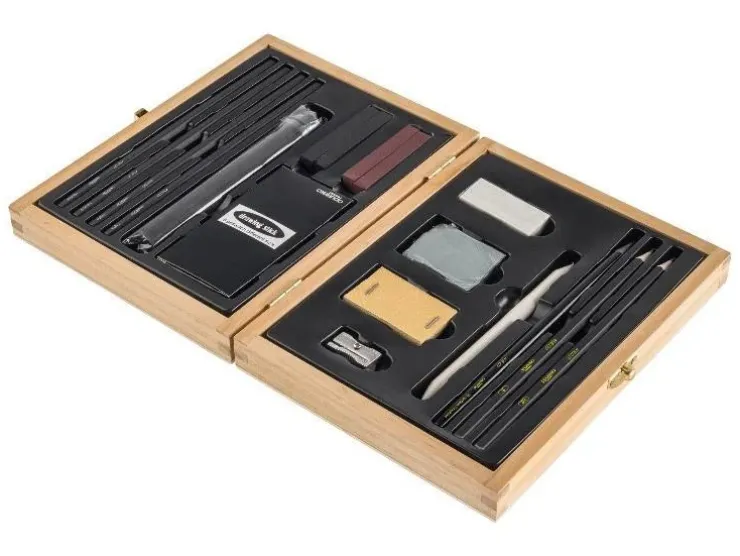 Teckningsset i vacker träask. Innehåller bland annat grafitstift, kolpennor, och andra användbara tillbehör för teckning.