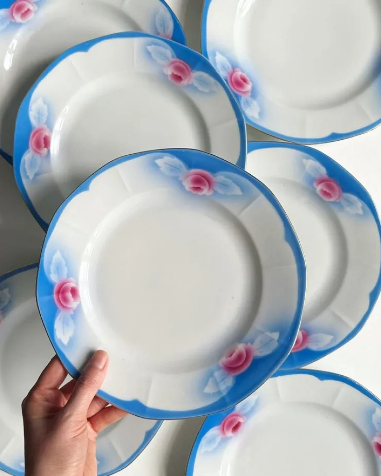 7 middagstallerkner fra Victoria China Czechoslovakia med smuk, smuk dekoration og farve, og diskret guldkant. Ekstremt velholdte!