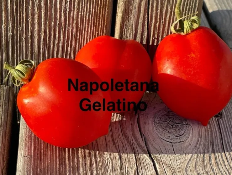 Tomatfrön av sorten Napoletana Gelatino. Bilderna visar hur tomaterna ser ut när de är mogna.