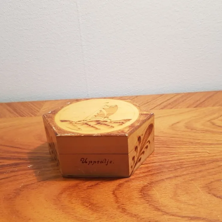 En liten trälåda med motiv av en segelbåt. Lådan är tillverkad i trä och har en liten storlek. Den är perfekt för att förvara småsaker.