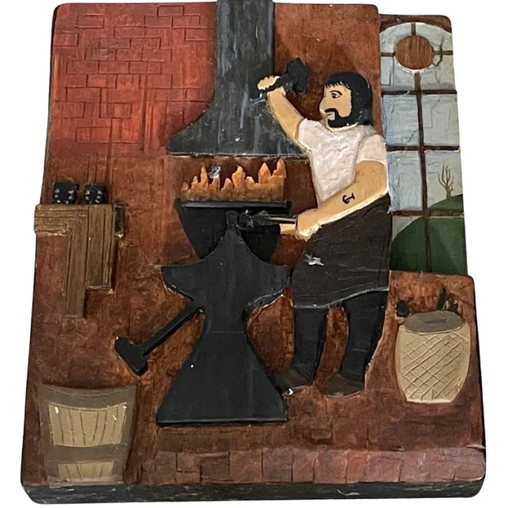 Tradera Trärelief, skuren dekor smed på jobbet| Relieffer