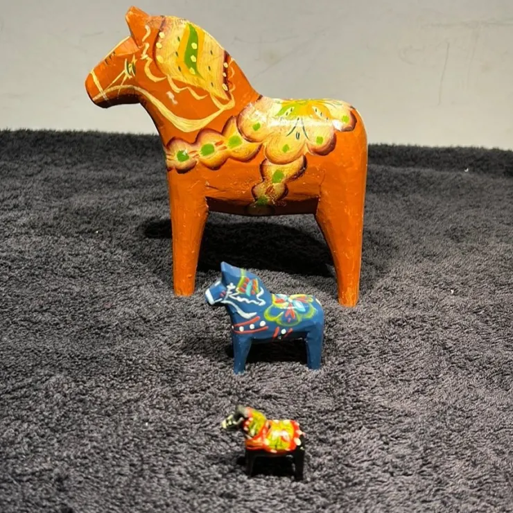 Säljer tre fina handmålade Dalahästar i olika storlekar. Den största är brun/orange (gammal), den mellersta blå och den minsta svart. Perfekta som dekoration eller samlarobjekt. Inga signaturer