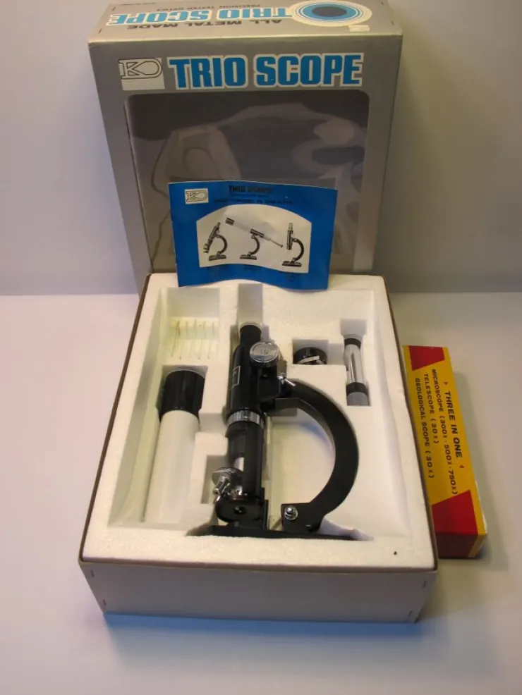Trio Scope er et unikt 3-i-1-sæt, der indeholder et mikroskop (300x-750x), et teleskop (30x) og et geologisk mikroskop (30x). Alt i metal med præcisionstestede linser. Perfekt til den nysgerrige! Leveres i originalemballage.