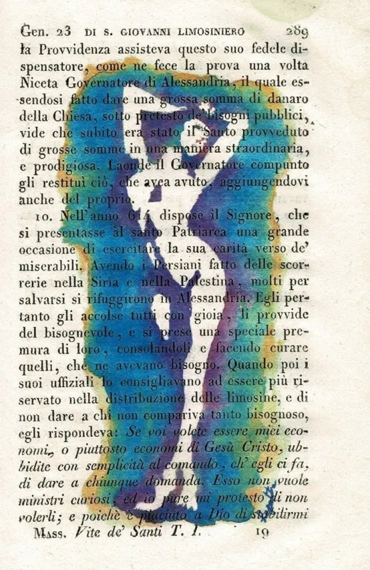 Tryck av min målning på en sida ur boken "Lives of the Saints" från 1829. Sidan/konstverket mäter 6×3,6 tum eller 15×9 cm. Med tiden har sidorna gulnat vackert, har veck och färgförändringar. Varje transkription är unik och finns på en enda sida i boken. Varje konstverk är signerat av konstnären. Köp direkt från den italienske konstnären Pasquale Lagatta. För ytterligare information, kontakta artisten personligen. Levereras i vadderat kuvert
