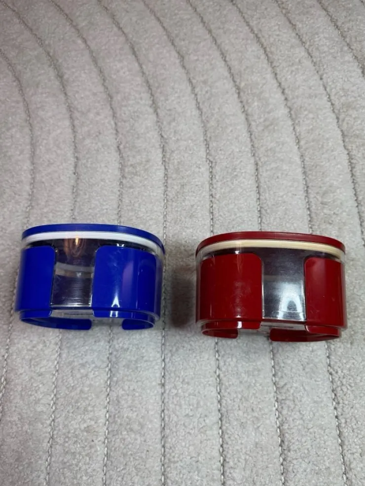 Två Tupperware förvaringsburkar i blått och rött. Varje låda rymmer 0,7L.