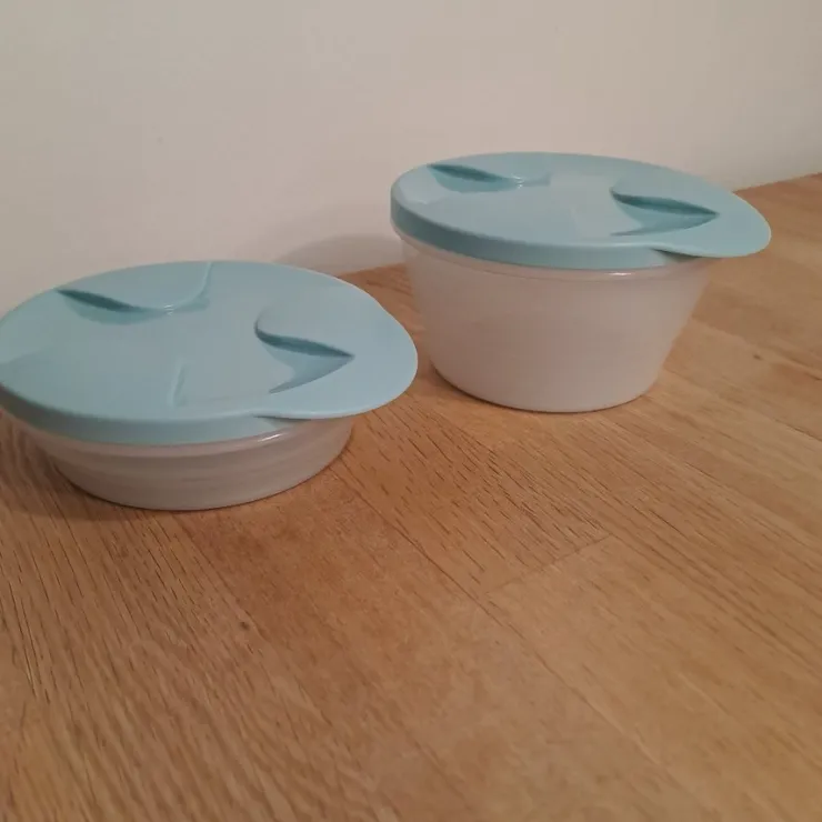 Två Tupperware matlådor säljes. En på 240ml och en på 500ml. Båda med ljusblå lock.