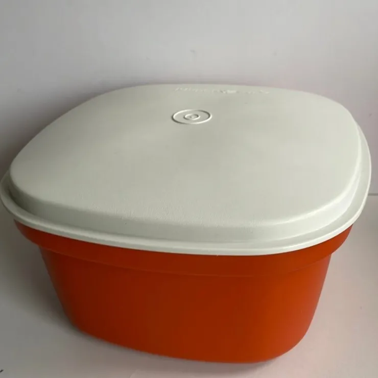 Större orange Multilåda från Tupperware . Mått: 12 cm hög och 24x24cm bred.