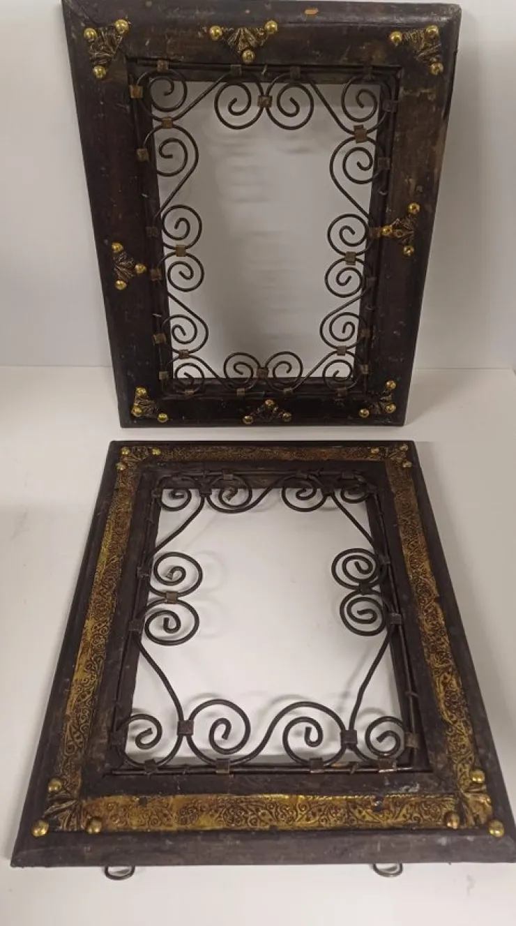 Två äldre vackra ramar i mörk trä med intrikata metalldetaljer. Ramarna har en elegant design med mönster och detaljer i metall. Perfekta för att rama in foton, konstverk eller andra prylar. De har hångare på baksidan för enkel upphängning.