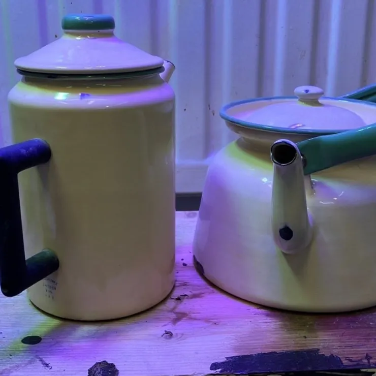 Tradera Två emaljerade kannor| Husholdningsartikler