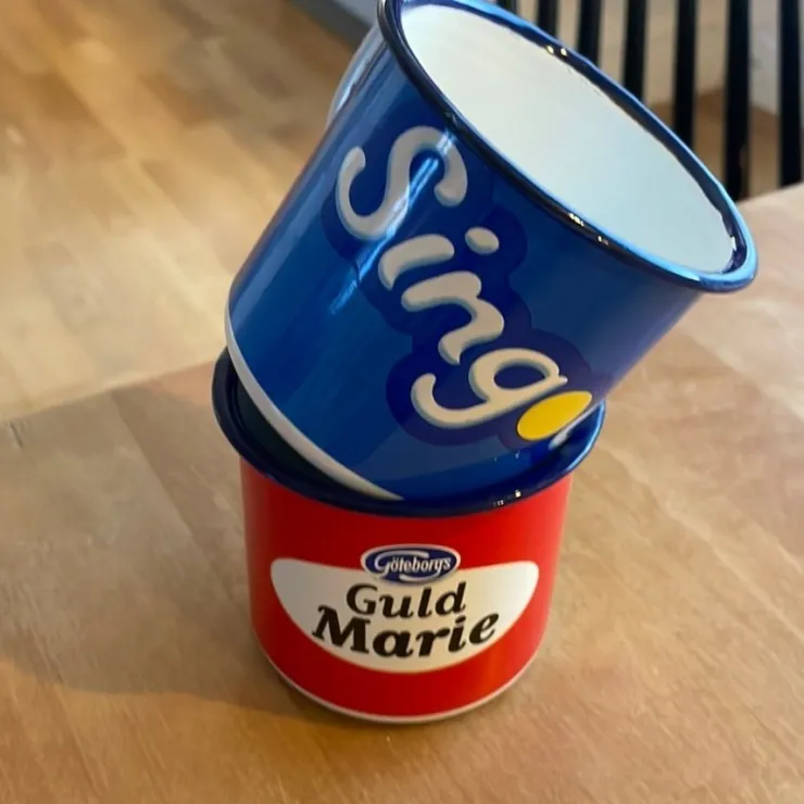 Säljer två fina emaljmuggar. En med Singoalla-motiv och en med Göteborgs Guldmari-motiv.