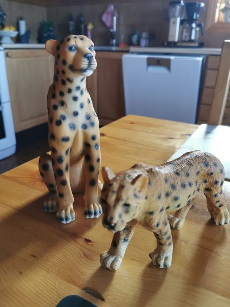 Två fina lejonfigurer i någon form av konstmassa. Den ena sitter och den andra står.