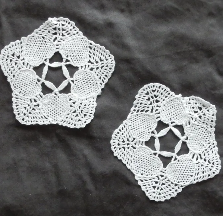 Två små virkade dukar/stjärnor, ca 9 cm i diameter