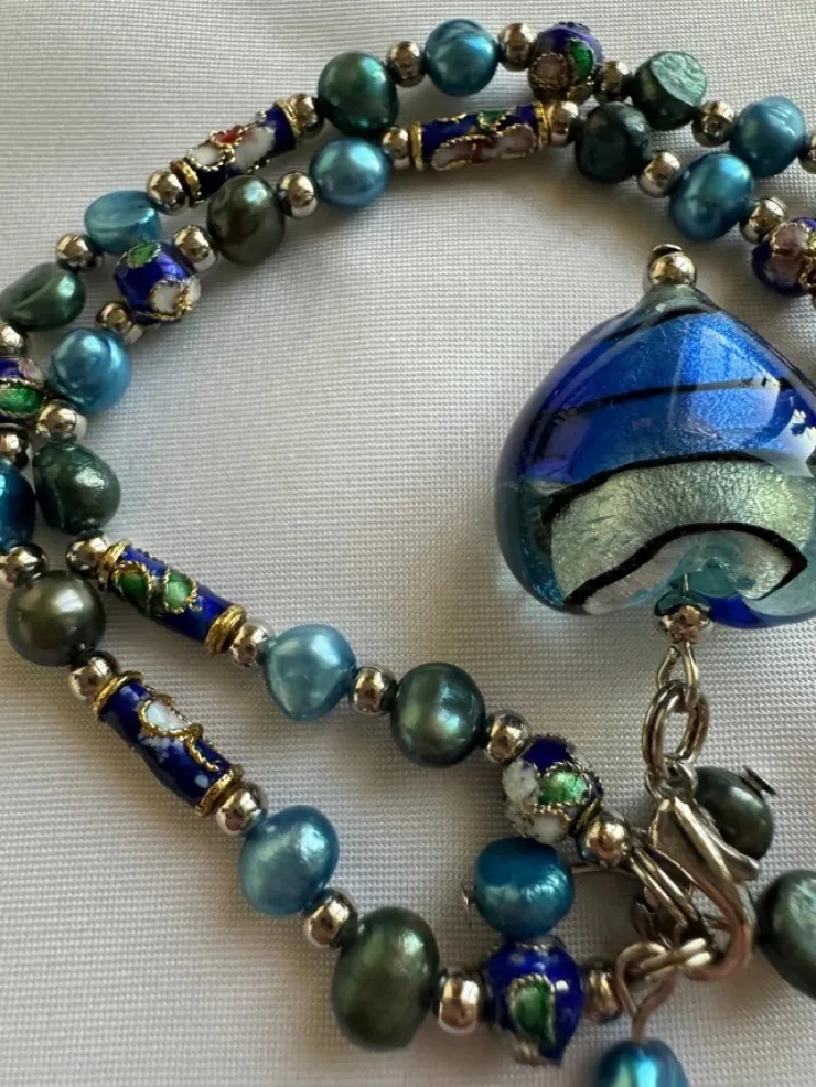 Tvåradigt halsband i norrskens färger (gröna och blåa sötvattenspärlor).