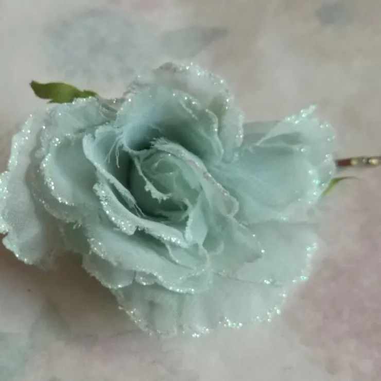 Hårspänne; Ljusblå blomma i tyg med skimrande glitter & gröna blad