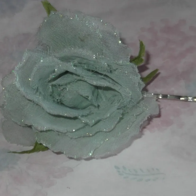 Hårspänne; Ljusblå blomma i tyg med skimrande glitter & gröna blad