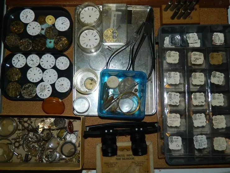 Stor samling av olika urverk och urdelar, perfekt för urmakare eller samlare. Samlingen inkluderar ett brett urval av urtavlor, visare, mekanismer, fjädrar, och andra komponenter. Det finns även specialverktyg, såsom en lupp för urmakare och stansverktyg. Många av delarna är antika och kan vara av stort intresse för entusiaster. Bilderna visar detaljerna i samlingen. Observera att detta är en samling av lösa delar och inte kompletta fungerande ur.