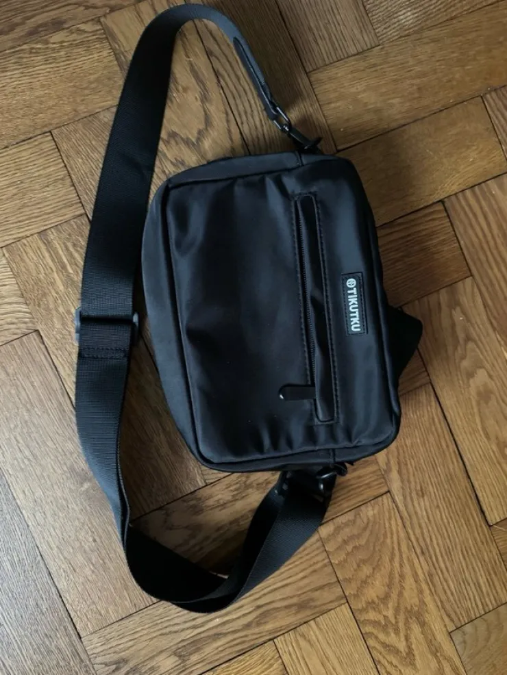 Perfekt väska, crossbody med reglerbar längd på remmen, man kan även använda den som magväska. På kortsidan finns ett fack invändigt för att lägga en rulle bajspåsar, och ett hål som påsen lätt dras igenom. Ett fack på framsidan med dragkedja.