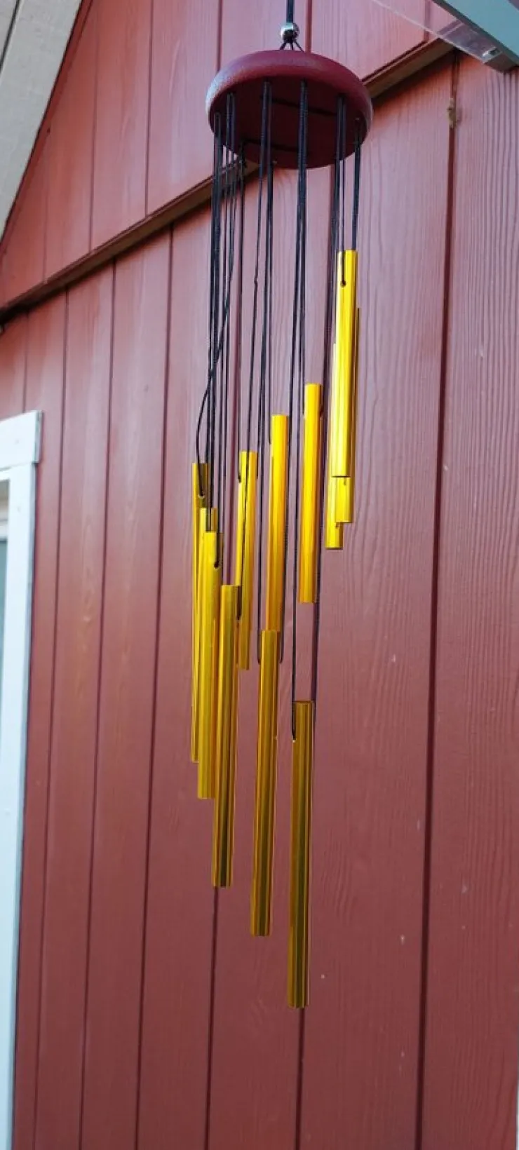 Tradera Vindspel I gul/guldfärgad metall. Vacker klang.| Havedekorationer