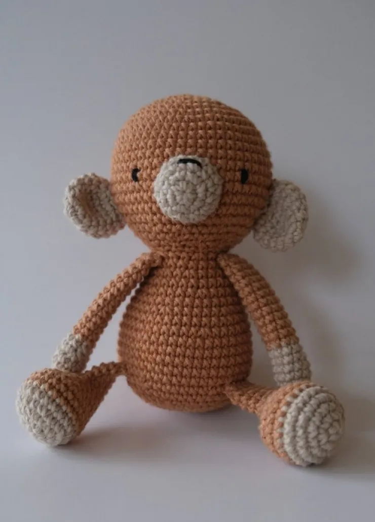 Virkad apa, ca 18 cm lång. Helt ny, virkad för hand av mig. Apan är virkad med garn av 100% bomull och fylld med allergisäker vadd. Broderade ögon och detaljer för att den ska vara säker även för de allra minsta.
