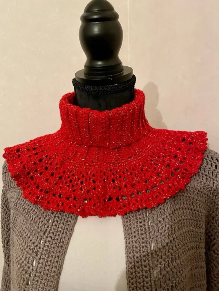 Virkad ”fuskolle” i rött garn av merinoull med glittrande guldtråd invirkad.