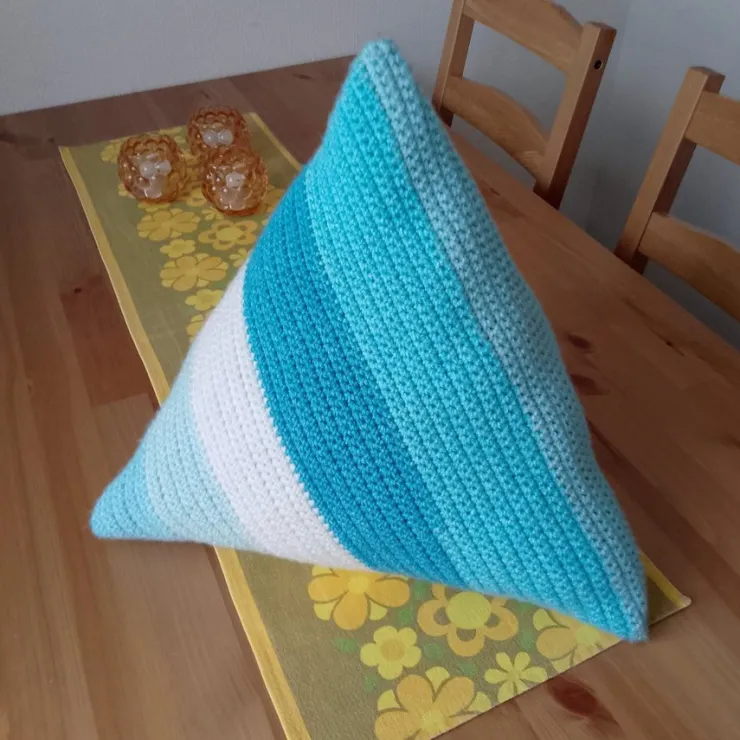 En retrokudde virkad efter ett mönster från 70talet i nyanser av blått och vitt.
