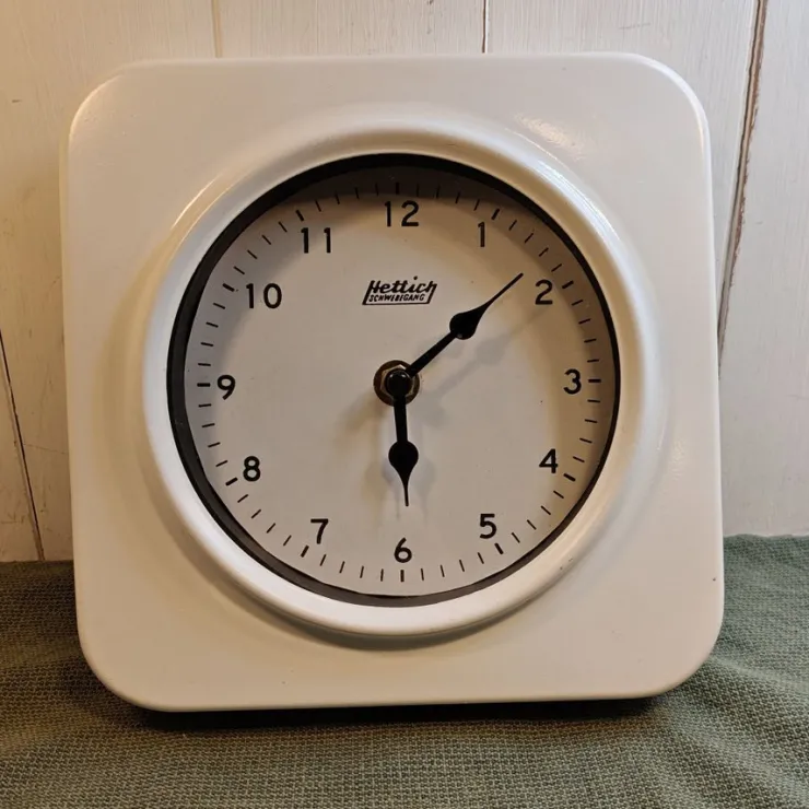 En vit väggklocka i metall med härlig retrokänsla.