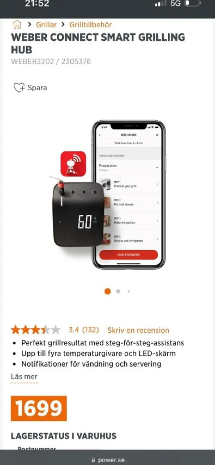 Weber Connect smart grill-hub är din hemliga ingrediens för perfekt grillresultat. Detta är en grillassistent som skickar stegvisa beskrivningar direkt till din smartphone. Här finns allt, från nedräkningstimer för när maten är klar till information när det är dags att vända och servera. Allt du behöver göra är att titta på telefonen så vet du att allt fungerar som det ska och du får perfekt grillresultat.