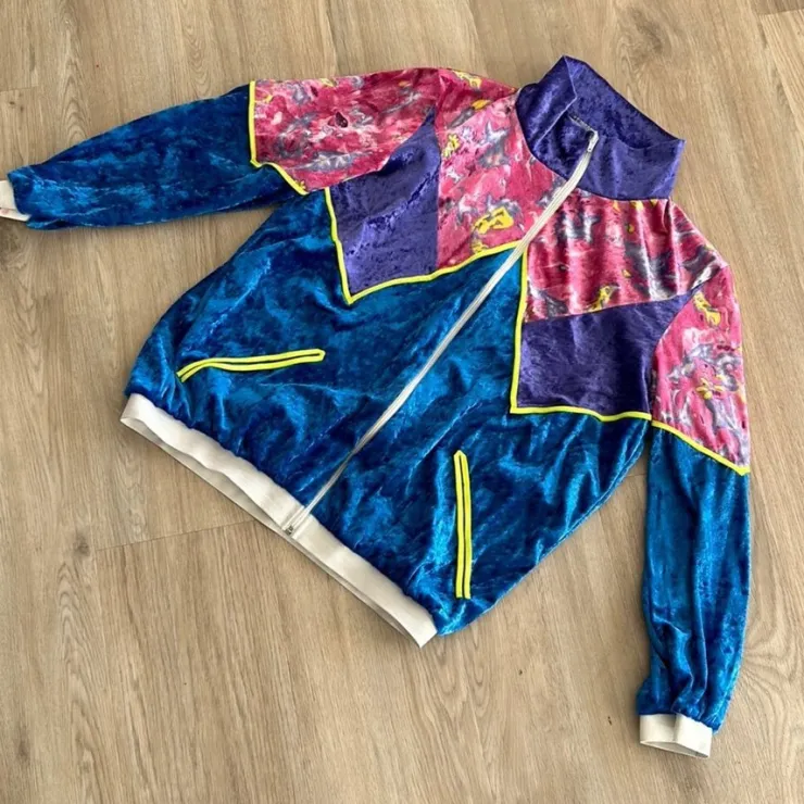 En blå sammetsjacka med färgglada paneler och detaljer. Jackan har en dragkedja framtill och en hög krage. Den har även två fickor på framsidan.