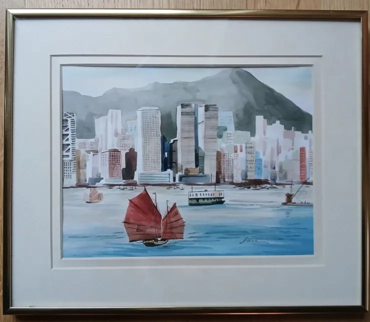 Vacker akvarellmålning föreställande Hongkongs hamn med stadsbilden i bakgrunden. Målningen är signerad.