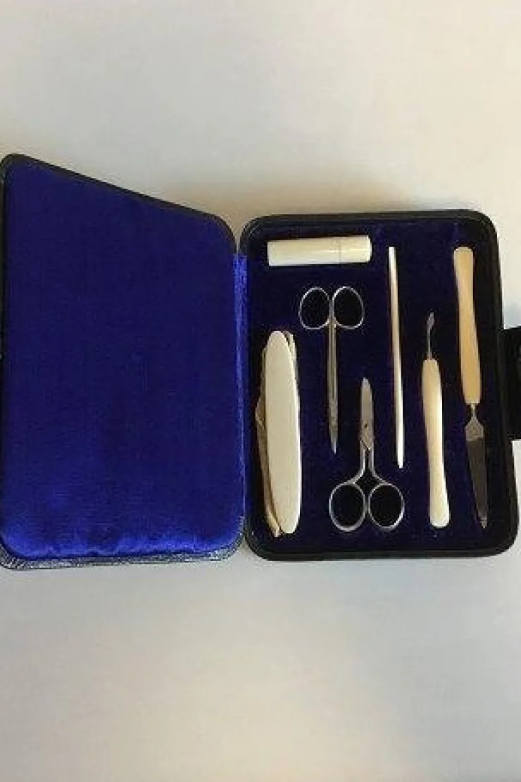 Neglesæt/Pedicuresæt i etui beklædt med sort skai. Skafter af ben. Måler 20 cm x 15 cm—