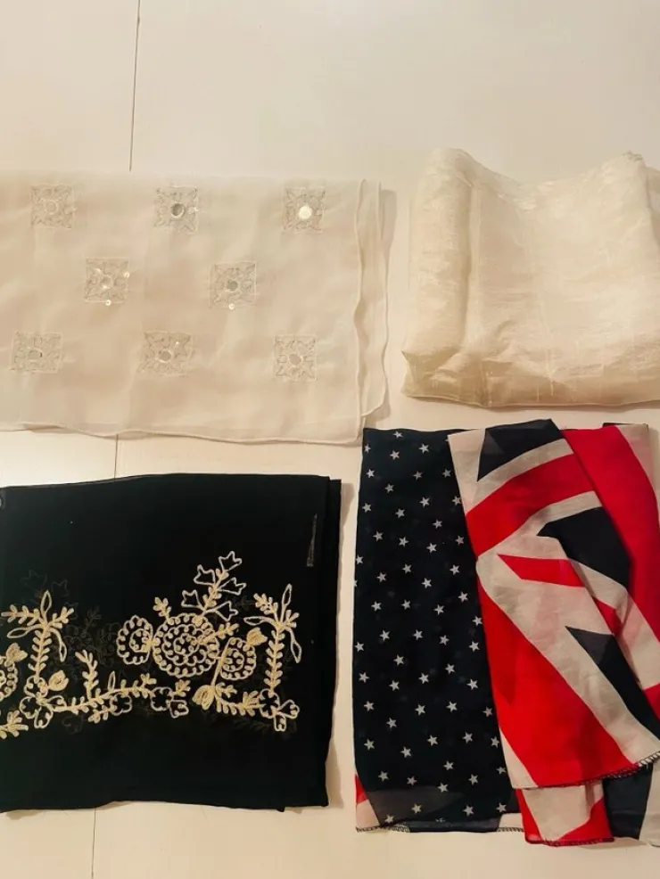Sjalen är vit med små speglar och mönster. Den är i en tunn och med genomskinligt tyg. Den andra sjalen är svart med vit brodyr och mönster. Den är också i en tunt och genomskinlig tyg. Den tredje sjalen är i en blandning av färger med en amerikansk och brittisk flagga. Den är också i en tunn och genomskinligt tyg. Den fjärde sjalen är vitt och tunn med fransar. Du står för porto och jag för emballaget.