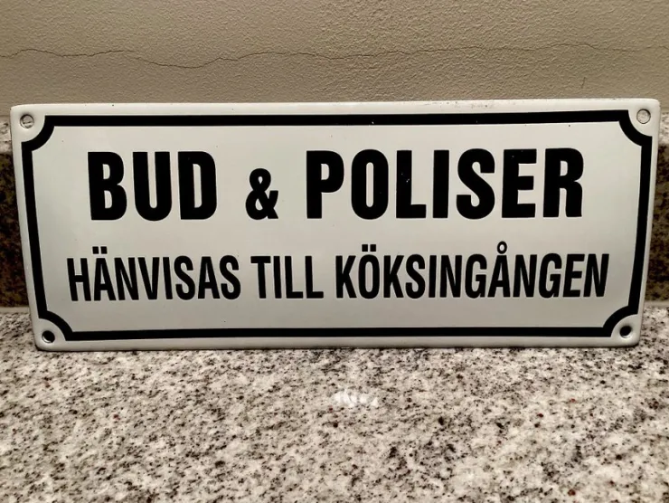 emaljskylt med texten "Bud & Poliser hänvisas till köksingången".