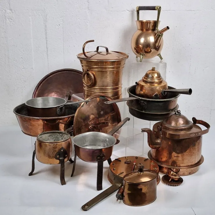 Parti kopparföremål – Kaffepannor, Grytor och balja, mm. i koppar – 1900-tal – Antika