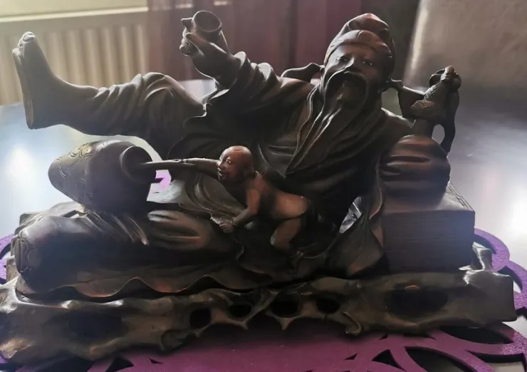 Handsnidad träfigur föreställande en liggande vis man med ett barn. Figuren är detaljerad och uttrycksfull. Träslaget är okänt, men figuren har en mörkbrun finish. Det finns en märkning på undersidan av basen (se bild). En unik och dekorativ skulptur.