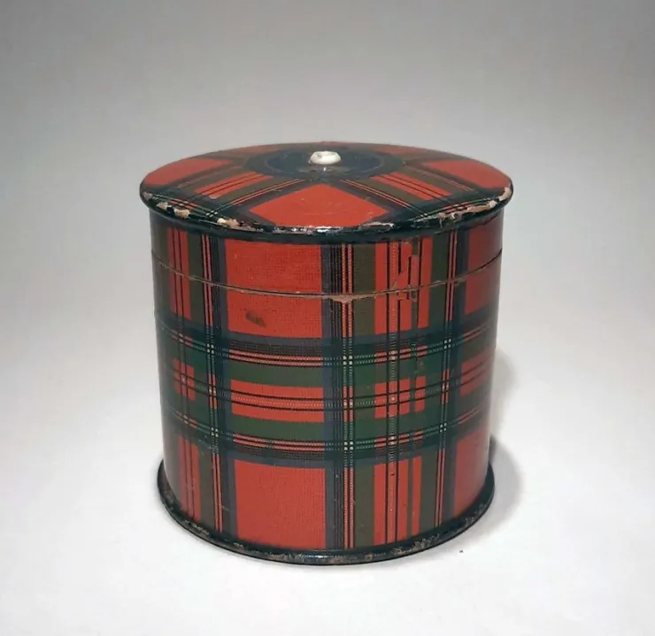 En så fin gammal antik trådburk eller trådhållare i trä med dekor i Skotskrutigt "Tartan" mönster från "Stuart2 Klanen och har etikett från Clark & Co se bilder.