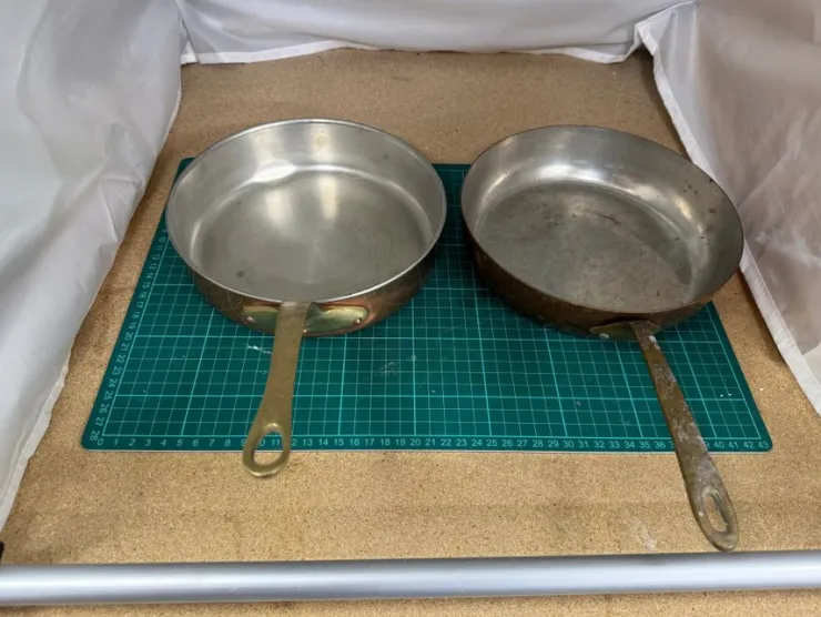 Två fina koppar stekpannor en ser ut att vara från PROMETEUS säljes. Pannorna är i bra skick och redo för användning.