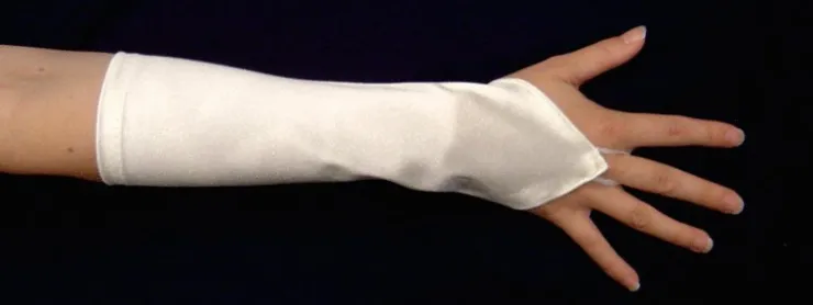 Mycket fina benvita handskar i blankt lyxigt material. Kort modell. Handskarna har en liten ögla som man sticker långfingret i för att hålla handsken på plats.