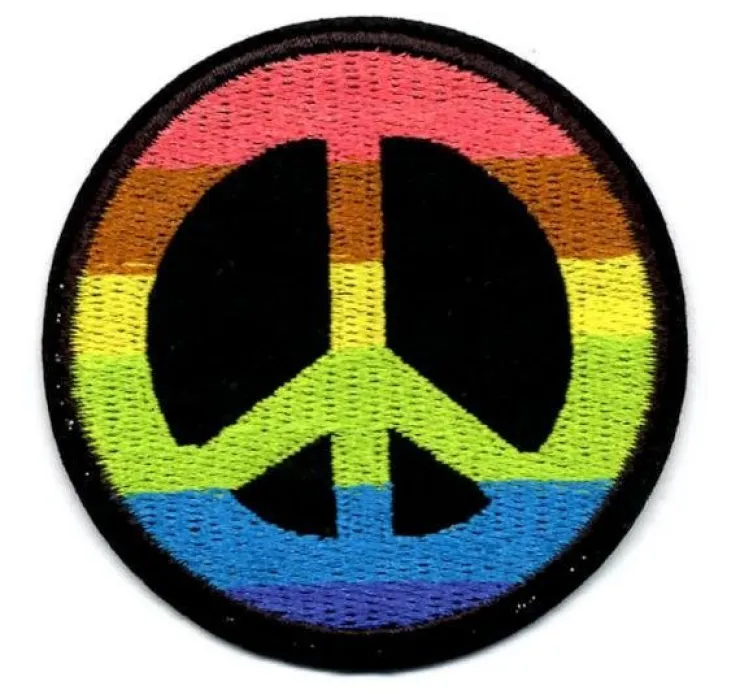 Här är fredsmärket kombinerat med regnbågsflaggan/pride-flaggan viken också är en freds- och kärlekssymbol.