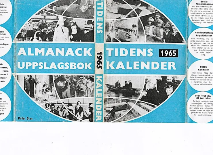 Tidens Kalender 1965 är en almanack och uppslagsbok med information om året 1965, inklusive helger, högtider, solens upp- och nedgång, kartor, sportresultat och mycket mer. Boken är i mycket bra skick med tanke på åldern.
